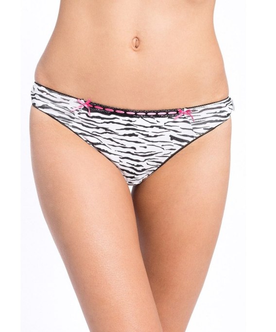 Wzorzyste stringi damskie, wykonane z przyjemnej dla skóry bawełny z dodatkiem elastanu (5%). W pasie wykończone koronką i ozdobną tasiemką z kokardkami.