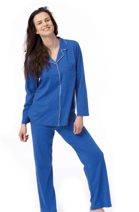 Piżama damska z długim rękawem, rozpinana. Na wysokości piersi kieszonka ozdobiona aplikacją. Skład: 65% bawełna, 35% poliester.