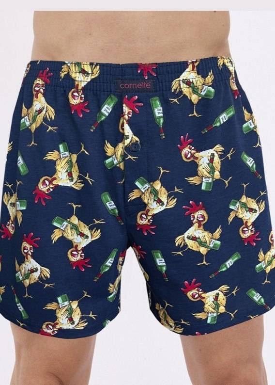 Luźne bokserki męskie posiadają dłuższe nogawki (często do połowy uda) oraz rozporek zapinany na guziki. Zapewniają dużą swobodę ruchów i przewiewność. Wzorzyste- ozdobione zabawnym motywem w kurczaki. Skład: 100% z bawełny.