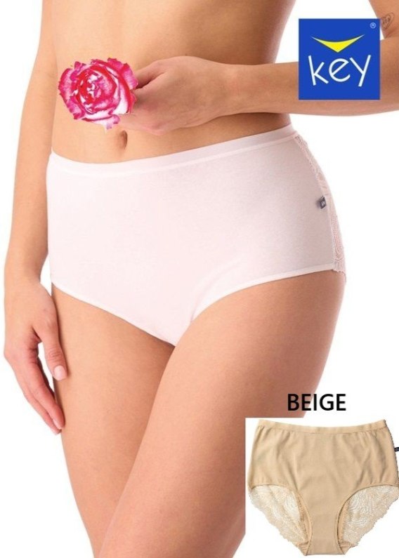 Figi damskie o wysokości do pępka, w całości zakrywające pośladki. W pasie miękka gumka pokryta gęstym, wygodnym, bardzo rozciągliwym szwem. Tył fig ozdobiony kwiatową, rozciągliwą koronką. Skład: 95% bawełna, 5% elastan.
