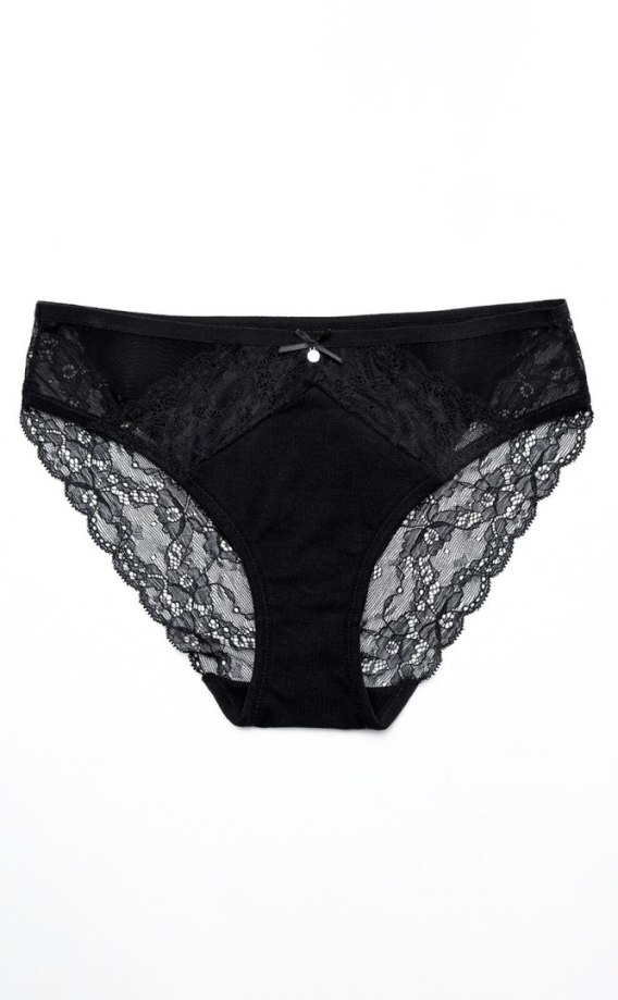 Figi damskie o kroju bikini z wysokiej jakości bawełny.Z przodu tiulowe i koronkowe wstawki, tył nogawek obszyty ażurową koronką. W pasie płaska gumka z satynową kokardką i srebrną zawieszką z logo. Pakowane po dwie szt. Skład: 95% bawełna, 5% elastan.