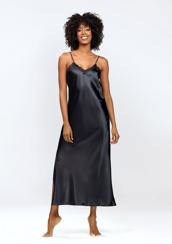 Koszulka nocna Abeni to klasyka i elegancja w jednym. Długa satynowa koszulka nocna posiada subtelne koronkowe wykończenie, które nadaje jej zmysłowości. Halka ma dwa mocne wycięcia po bokach. Jej klasyczny krój sprawia, że każda Kobieta będzie czuła się w niej elegancko i komfortowo.