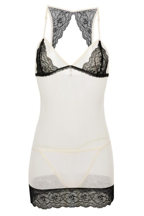 PONĘTNY, ZMYSŁOWY KOMPLET DWU CZĘŚCIOWY Z KTÓREGO W SKŁAD WCHODZĄ KOSZULKA ORAZ STRINGI. GÓRA KOSZULKI WYKONANA Z DELIKATNEGO, PRZEJRZYSTEGO TIULU ORAZ ZMYSŁOWEJ KORONKI, ZDOBIONY BIŻUTERYJNĄ SYMILKĄ. TYŁ KOSZULKI WYCIĘTY W KSZTAŁCIE TRÓJKĄTA OZDOBIONY KORONKĄ. DÓŁ WYKOŃCZONY ELASTYCZNA KORONKĄ. RAMIĄCZKA REGULOWANE.
