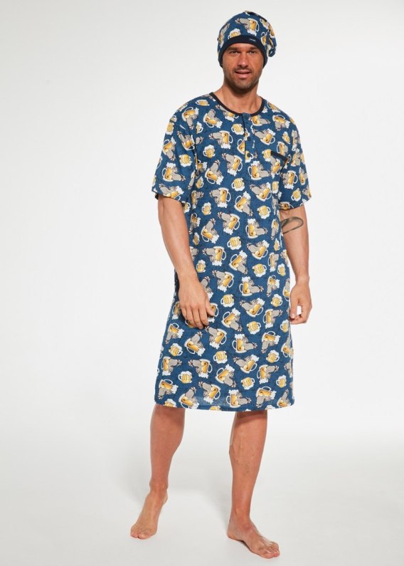 Koszula nocna męska z krótkim rękawem wykonana z wysokiej jakości bawełna. Dekolt półokrągły, zapinana na trzy guziczki. Do kompletu szlafmyca. Skład: 100% bawełna.