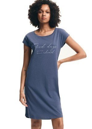 Bawełniana koszula damska z krótkim rękawem i okrągłym dekoltem. Przód ozdobiony nadrukiem, dół lekko zaokrąglony. Skład: 100% bawełna.
