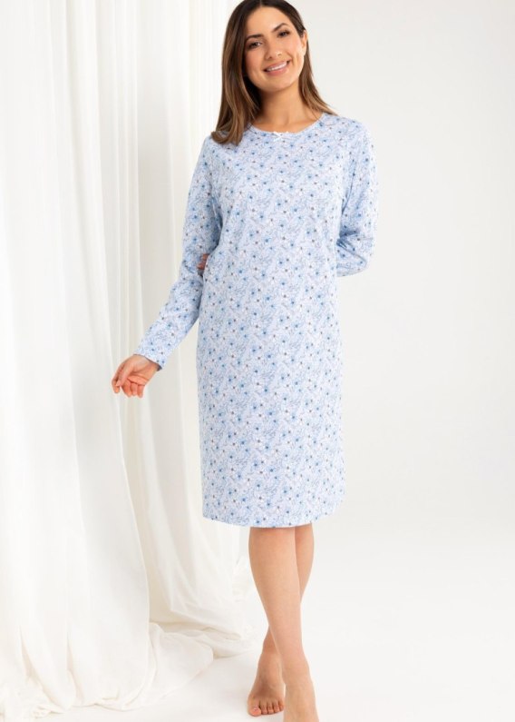 Koszula damska z wysokiej jakości bawełny we wzór drobnych kwiatów. Dekolt okrągły ozdobiony kokardką i delikatnym obszyciem, rękaw długi, długość do kolana. Skład: 100% bawełna.