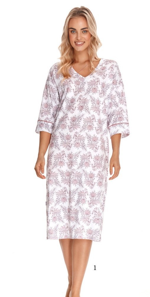 Koszula damska z rękawem 3/4 wykonana z wysokiej jakości bawełny. Dekolt w kształcie litery V, długość do kolana. Mankiety obszyty delikatną lamówką. Skład:100% bawełna.