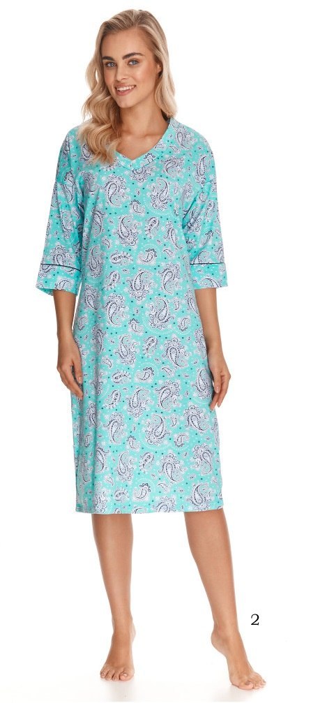 Koszula damska z rękawem 3/4 wykonana z wysokiej jakości bawełny. Dekolt w kształcie litery V, długość do kolana. Mankiety obszyty delikatną lamówką. Skład:100% bawełna.