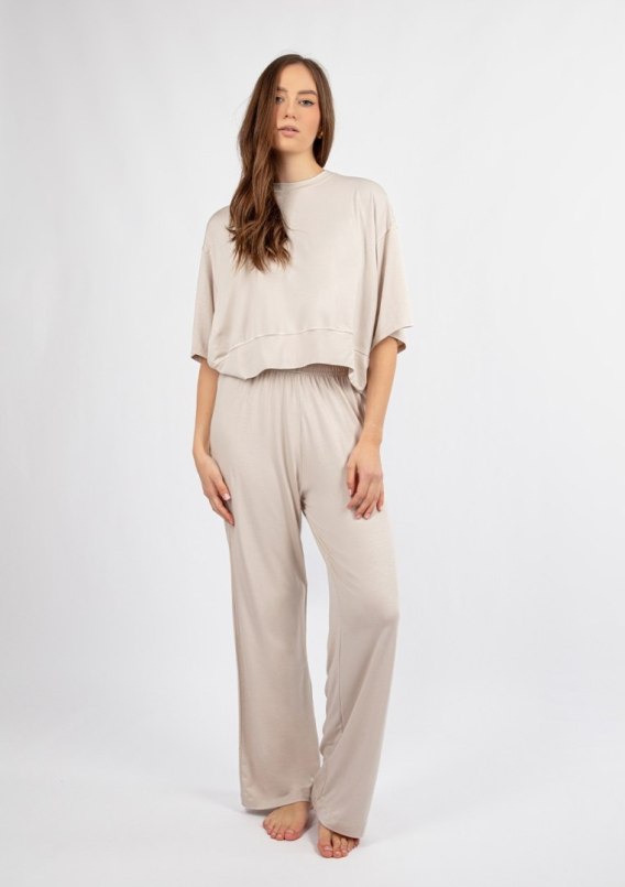Kremowy kolor kompletu DK-K-B20 to strzał w dziesiątkę, jeśli chodzi o bazę do stylizacji. Jest na tyle neutralny, że z łatwością można go łączyć z innymi barwami, zarówno stonowanymi, jak i bardziej wyrazistymi. Taki zestaw doskonale sprawdzi się podczas relaksu w domu, na spotkaniu z przyjaciółmi, a nawet jako stylowy outfit na wyjazd.