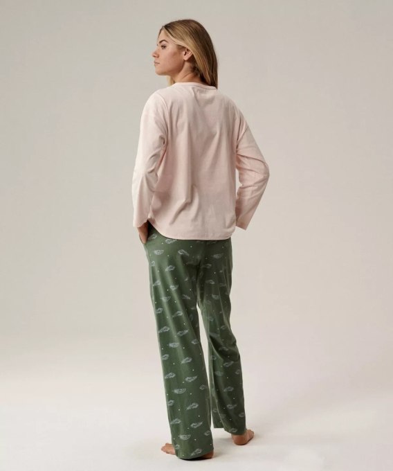 Piżama składa się z luźnej góry (longsleeve) z okrągłym dekoltem i długimi rękawami oraz długich spodni, które mają szerokie, swobodnie puszczone nogawki, trzy ozdobne guziczki, boczne kieszenie oraz elastyczną gumę w pasie. Skład: 100% bawełna.