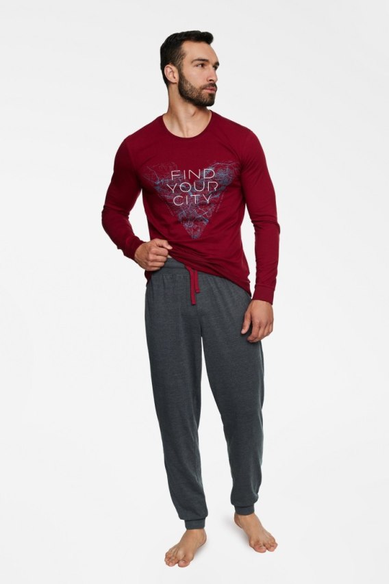 Piżama męska wykonana z wysokiej jakości bawełny. Bluzka z długim rękawem, zakończona ściągaczem, ozdobiona napisem. Spodnie długie,zakończone ściągaczem. Skład: kolor 99X 100% bawełna, kolor 33X bluzka 100% bawełna, spodnie 60% bawełna, 40% poliester.