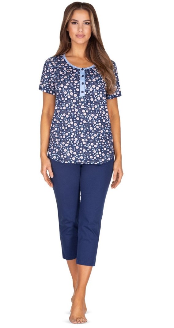 Piżama damska wykonana z wysokiej jakosci bawełny. Bluzka z krótkim rękawem, rozpinana na guziczki od góry, wzorzysta. Spodnie gładkie rybaczki. Skład: 100% bawełna.