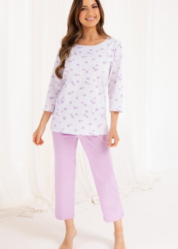 Bawełniana piżama damska. Koszulka wzorzysta z rękawem 3/4, dekolt półokrągły. Do kompletu spodnie jednolite o długość 7/8. Skład: 100% bawełna.