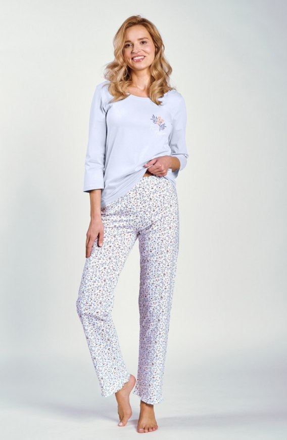 Piżama idealna na chłodniejsze wieczory i noce. Wykonana z bawełny, zapewnia wygodę i miękkość. Długie spodnie wykończone falbanką i rękaw 3/4. Skład: 100% bawełna.