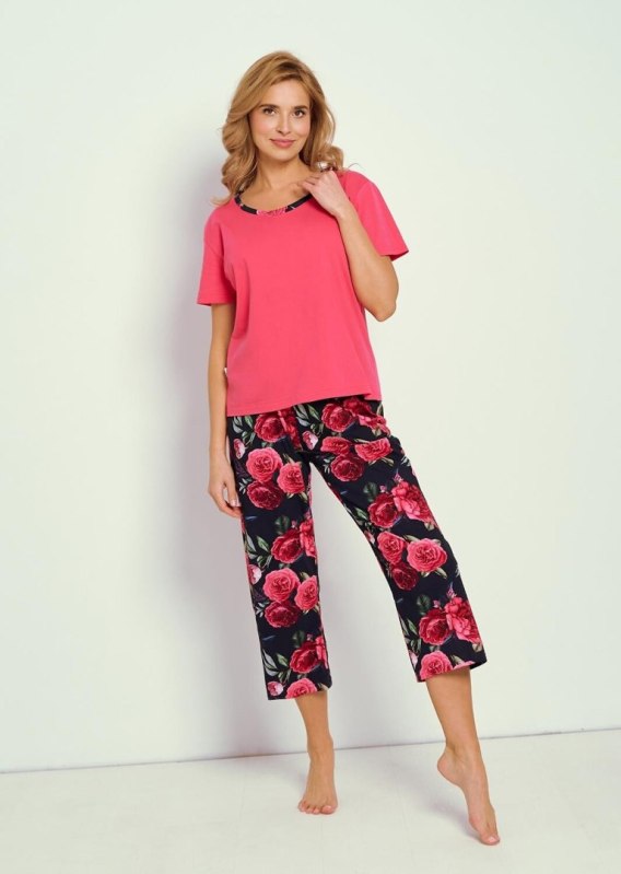 Dwuczęściowa piżama damska z wysokiej jakości bawełny. Koszulka jednolita z krótkim rękawem o luźnym, swobodnym fasonie z półokrągłym dekoltem zdobiony lamówką w kolorze spodni. Wygodne, wzorzyste spodnie o długości 3/4. Skład: 100% bawełna.
