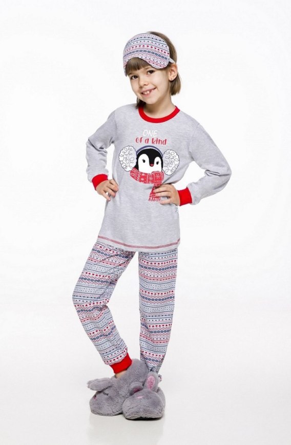 Piżama dziewczęca z wysokiej jakości bawełny. Koszulka z długim rękawem ze ściągaczem ozdobiona nadrukiem. Spodnie długie, wzorzyste, zakończone ściągaczami. Skład: 92% bawełna, 8% elastan.