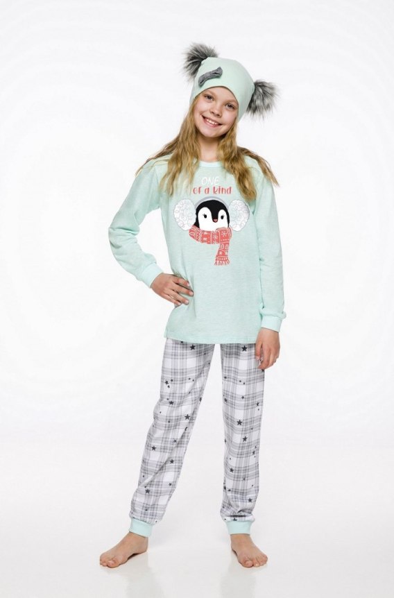 Piżama dziewczęca z wysokiej jakości bawełny. Koszulka z długim rękawem ze ściągaczem ozdobiona nadrukiem. Spodnie długie, wzorzyste, zakończone ściągaczami. Skład: koszulka 95% bawełna, 5% elastan; spodnie 100% bawełna.