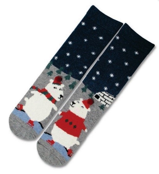 Ciepłe skarpetki damskie z domieszką wełny z grafiką niedźwiedzi polarnych na łyżwach. Nieuciskający ściągacz. Są miękkie i komfortowe. Wykonane z najwyższej jakości materiałów. Skład: 60% poliamid, 23% akryl, 7% wiskoza, 5% wełna, 3% angora, 2% elastan.