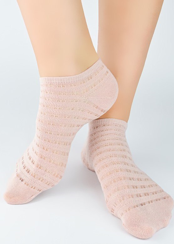 Żakardowe skarpety damskie bardzo miłe w dotyku z dzianiny zapobiegającej poceniu się, w ciekawy wzór. Nieuciskający ściągacz, płaskie szwy, idealnie dopasowują się do stopy. Skład: 75% bawełna, 22% poliamid, 2% elastan.