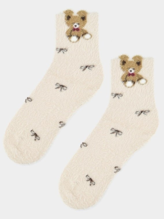 Skarpety damskie wykonane z miękkiej, puchatej dzianiny wzorowanej w kokardki z misiem na ściągaczu. Wygodny, nieuciskający ściągacz.