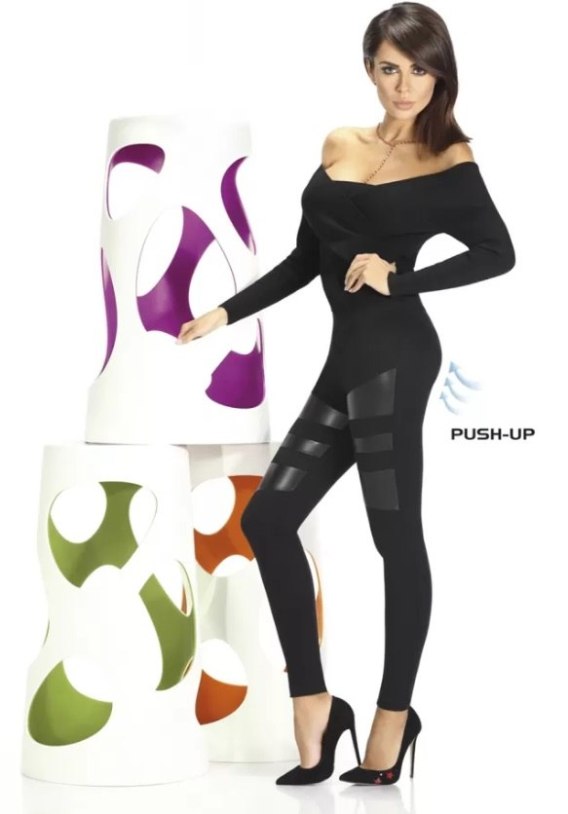 Stylowe legginsy wykonane z dzianiny elastycznej i obciskającej. Podnoszącym pośladki, wyszczuplające nogi. Wstawki z eco-skóry. Materiał w pełni kryjący, elastyczny, mocno modelujący sylwetkę. Skład: 62% wiskoza, 28% poliester, 10% elastan.