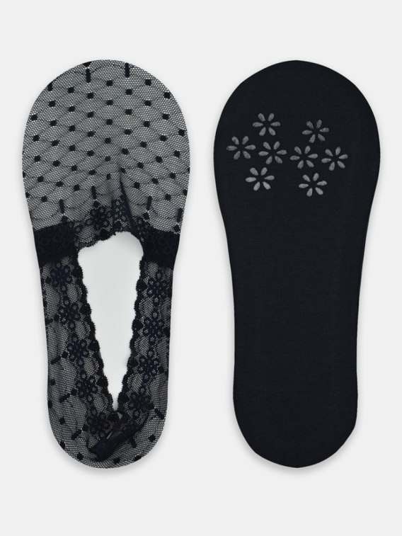 Balerinki damskie z koronki. Ściągacz posiada pasek silikonu, który zapobiega zsuwaniu, podeszwa z gładkiej bawełny z silikonowymi kwiatkami. Skład: wierzch 83% poliamid, 17% elastan; podeszwa 95% bawełna, 5% elastan.