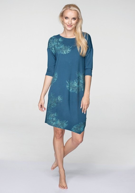 Sukienka damska z rękawem 3/4 wykonana z miękkiej dzianiny wiskozowej. Wewnętrzna strona wykończona pętelkowym splotem FRENCH TERRY. Przód ozdobiony nadrukiem, dół z asymetrycznym wykończeniem. Skład: 95% wiskoza, 5% elastan.