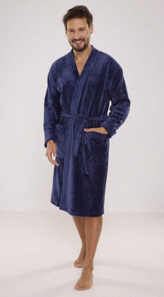 Wyjątkowo puszysty i ciepły szlafrok męski z kołnierzem, wiązany w pasie. Posiada wygodne kieszenie. Skład: 100% poliester.