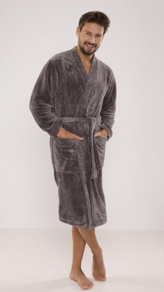 Wyjątkowo puszysty i ciepły szlafrok męski z kołnierzem, wiązany w pasie. Posiada wygodne kieszenie. Skład: 100% poliester.