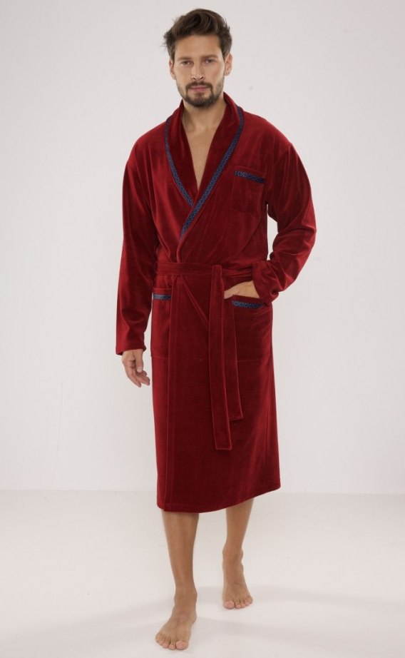 Wygodny szlafrok męski. Z szalowym kołnierzem, wiązany na pasek, ozdobiony na kieszeniach, kołnierzu i rękawach - lamówkami. Długość za kolana. Skład: 35% bawełna, 62% poliester, 3% elastan.