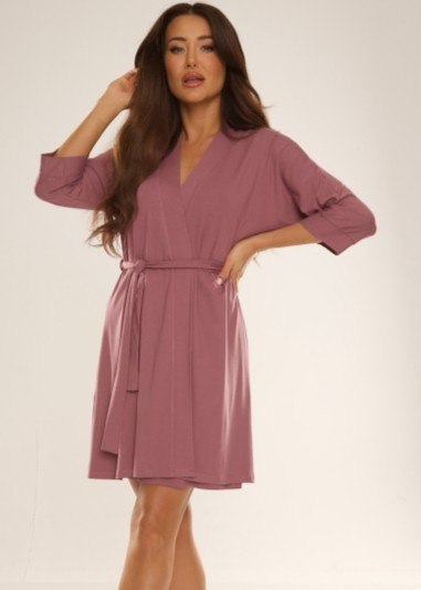 Elegancki, prosty szlafrok o minimalistycznym kroju dostępny w róznych kolorach. Długość do kolan, rękawy 3/4 , wiązany w pasie, wygodny w noszeniu. Pasuje do koszulek oraz piżam z kolekcji Visa. Skład: 94% viscosa, 6% lycra.