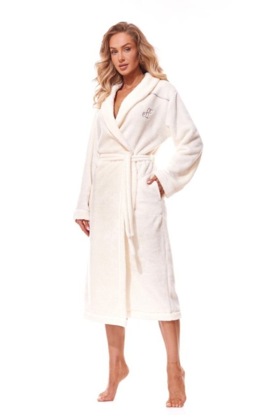 Szlafrok damski długi z kołnierzem wykonany z miłej, ciepłej i przyjemnej w dotyku tkaniny. Ozdobiony delikatną aplikacją. Skład: 100% poliester.