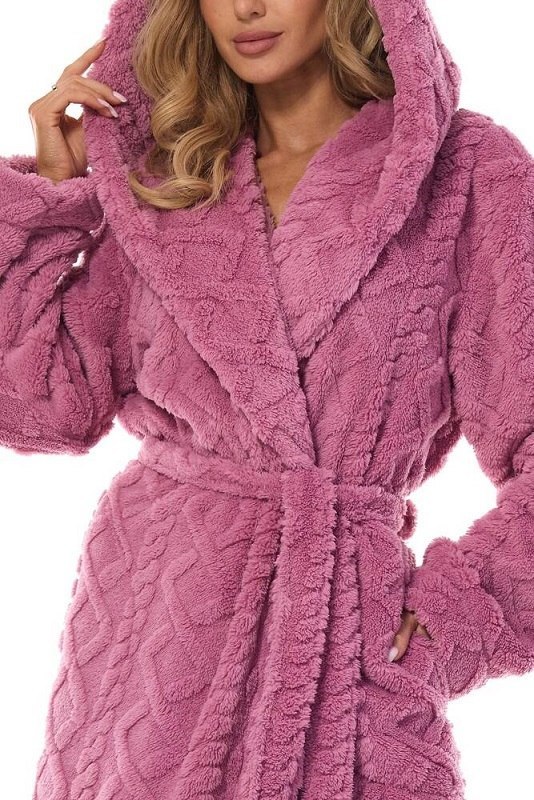 Szlafrok damski długi z kapturem z dzianiny typu super soft. Miękka dzianina z wytłaczanym wzorem. Wiązany w pasie, na wysokości bioder kieszenie.Skład: 100% poliester