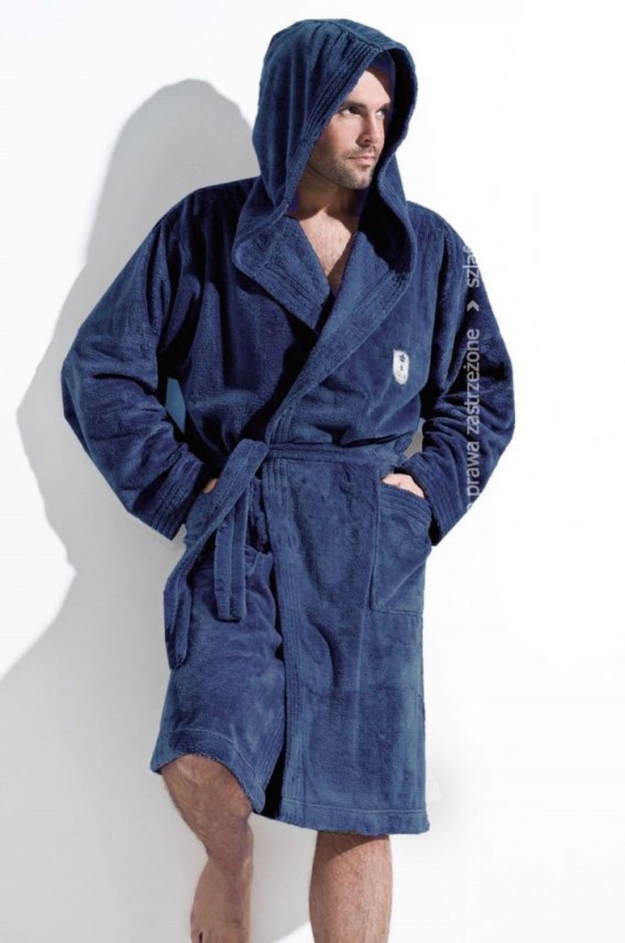 Szlafrok męski z kapturem, wiązany w pasie, z miękkiej dzianiny, na biodrach wygodne kieszenie, na wysokości klatki piersiowej naszyta aplikacja. Miły i przyjemny w dotyku. Skład 100% poliester.